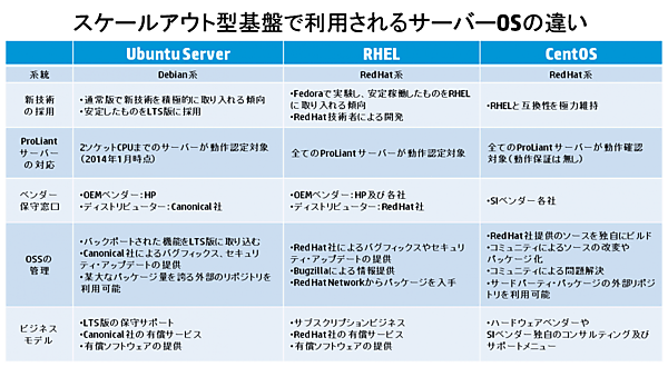 以下では、スケールアウト型サーバー基盤で比較的利用されることの多いCentOSとの違いも含め、比較表にまとめておきます。