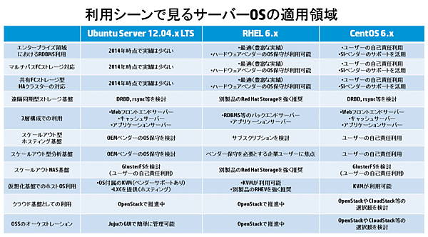 以下では、利用シーン別にサーバーOSの適用領域を2014年1月時点での最新OSで比較してまとめました。データベースやHAクラスタの利用だけでなく、スケールアウト基盤、仮想化、最近注目を浴びるクラウド基盤での比較もありますので、導入検討の際に参考にしてみてください。