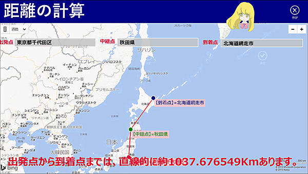「出発点」、「中継点」、「到達点」の正確な住所を入力して、それぞれの[決定]ボタンをタップしていきます。最後の「到達点」の[決定]ボタンをタップすると、キャラクタが「出発点」から「到達点」までの直線的な距離を音声で喋ります(図1)。