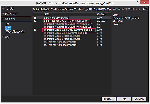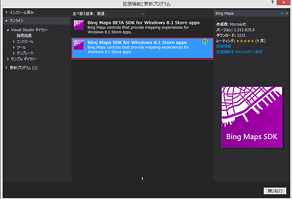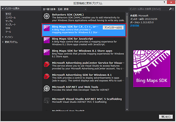 「拡張機能と更新プログラム」から「Bing Maps SDK for Windows 8.1 Store apps」のインストール
