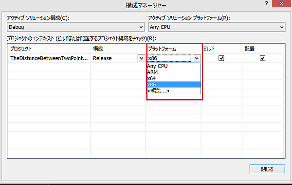 「プラットフォーム」がAny CPUになっているので、プルダウンメニューから、該当するプラットフォームを選択します。筆者の環境では×86を選択する必要がありました(図6)。