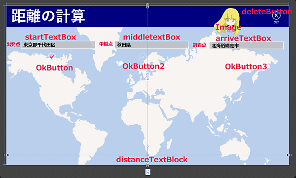 (10)「出発点」から「到達点」までの距離を表示する、「distanceTextBlock」という名前のTextBlock要素を配置します。