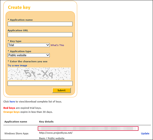 「Create key」の画面が表示されるので、必要な項目を入力してSubmitします。筆者は既にキーを持っているので、下記にキーが表示されています(図9)。Key typeはBasicとなっています。BasicでPublic websiteの場合は、「アプリケーションが制限なしに利用され、125,000 のトランザクションの任意の種類の 12 ヶ月の期間内を超えない、公開ウェブサイト。」となっているようです。このkeyをBing Mapsの中で使用します。
