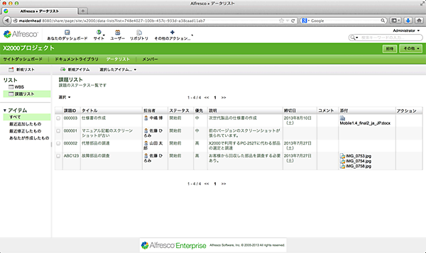 Alfrescoはファイルを格納、共有するだけではなく、表形式でデータ表現することができるデータリストの機能があります。データリストは、よくプロジェクト等で課題管理等を、Excelを使って表形式でまとめ、プロジェクトメンバーで共有することがありますが、データリストも同様の使い方ができます。また、アイテム(表中の行レコード)の中には、ファイルをAlfresco内のコンテンツにリンクすることができるので、補足説明資料や、参考資料をアイテムに関連づけることができます。