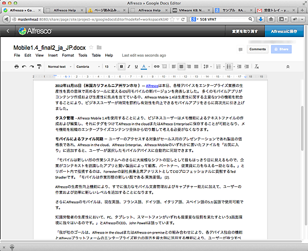Alfrescoでは、Google DocsでOffice文書を編集することができます。この機能によってOfficeをインストールしていないクライアントでも編集作業を行うことができると共に、Google Docsの特性を活かして、複数人でリアルタイム同時編集を行うことが可能です。