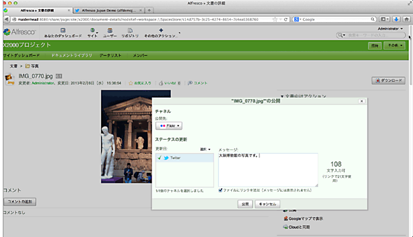 また、Alfrescoではソーシャルネットワークでよく利用されている「いいね」や「コメント」の機能も取り入れられています。「いいね」がたくさんついているコンテンツは、検索時に検索結果に入っていた場合には、検索結果の上位に表示されるようになります。