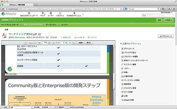 コンテンツにアクセスすると、コンテンツのプレビューを見ることができます。これはAdobe Flash Playerを使って表示されます。従来のファイルサーバーは、ファイル名だけで内容を判断して、中身は実際に開いてみないと分からないのですが、このプレビューのおかげで、必要なファイルをすぐに見つけることができ、ユーザーのPC上にファイルをダウンロードしなくても見ることができます。