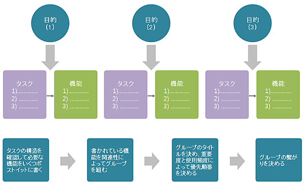 タスク分析の過程でよく使われる方法が カードソートであり、まずは思いつく言葉をカード(一般的に付箋紙を使用)に書きます。同じようなものをまとめてグルーピングし、必要によって移動、削除を行います。ここから導き出されたタスクを持ってユーザーシナリオを作成します。シナリオを読みながら頭の中にイメージを自然に描くことができれば、うまくいったシナリオだと思っても良いです。一方、読みながら何か考えることになったり理解できず困ることになったりした時は、また書き直して強化した方が良いと思います。
