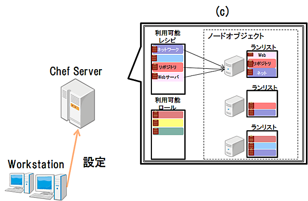 Chef Serverでノードオブジェクト(論理インスタンス)を作成し、アップロードしたクックブックとオブジェクトとの関連付けを行います。これはChef Server上で行われる論理的な設定です。