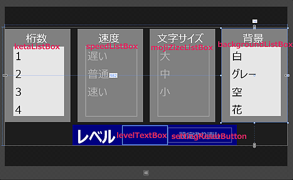 次に名前が「levelTextBlock」というTextBlock要素を配置します。最後に、名前がsettingResetButtonというButton要素を配置し、Contentプロパティに「設定やり直し」と指定します。このボタンは最初の状態では使用不可としておきます。