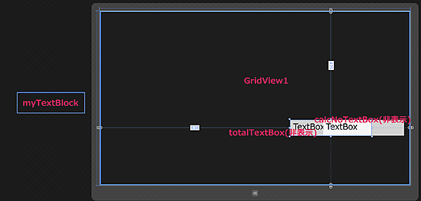 「totalTextBox」という名前のTextBox要素を配置します。この要素は非表示で、流れてくる数値の合計を入れておきます。