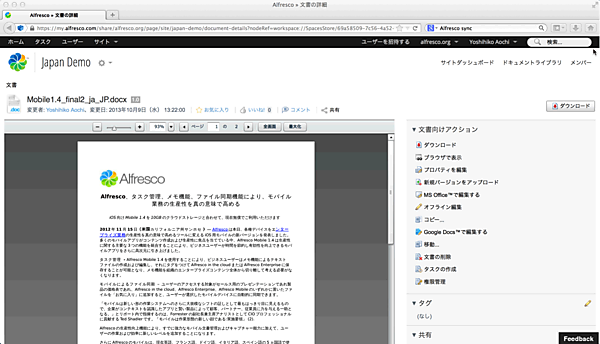 また、Alfresco in the cloudに対するCMISをベースにしたPublic APIを用意しているので、企業のエンタープライズアプリケーションやモバイルアプリケーションとの連携も可能です。既にAlfrescoではSalesforceとの連携アプリケーションをAppExchangeにて無償で公開しています。