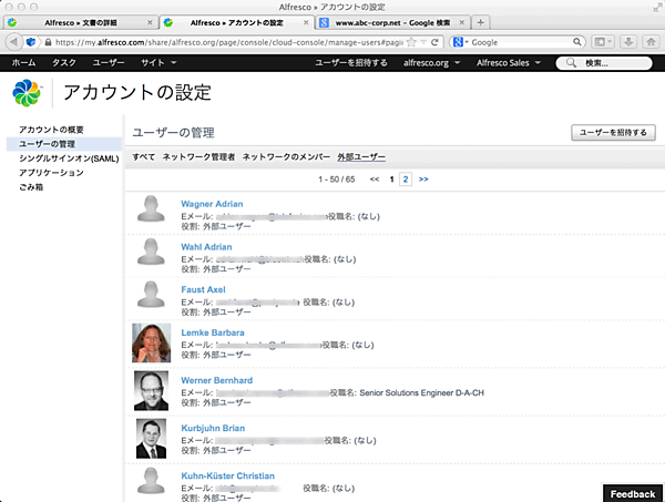 取引先のユーザーがコンテンツをアップデートした場合でも、Cloud Syncによって自動的に社内のAlfresco内のコンテンツも更新されます。企業のIT管理者も、共有されたコンテンツと、ユーザーをIT部門の管理下に置くことができるので安心です。なお、Cloud SyncはAlfresco Community EditionとAlfresco in the cloudの間では利用できません。