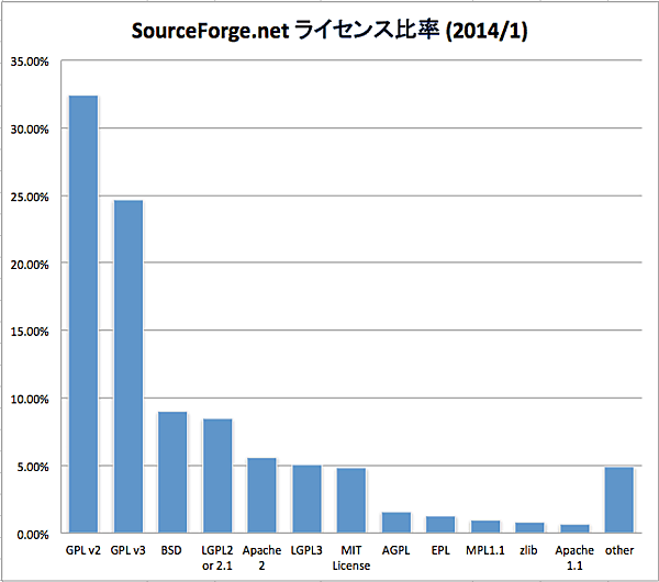 コピーレフト型のライセンスで最も有名なライセンスはFree Software Foundation(以下FSFとします)によって作成されたGNU General Public License(以下GPLとします)です。OSSライセンスの中でも飛び抜けて人気のあるライセンスです。オープンソースのプロジェクトが数多く登録されていることで有名なSourceForgeで本稿執筆時点(2014年1月)の状況を調べてみたところ、プロジェクトの内57.1%(GPL v2-32.4%、GPL v3-24.7%)のOSSにGPLが適用されていることがわかりました。