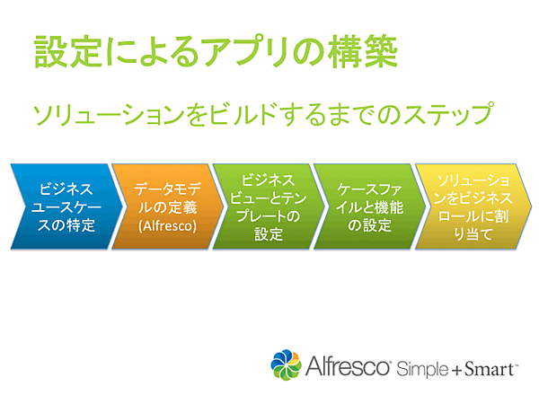 上記のビジネスロールや、ビジネスビューは、特別なプログラミング言語を使用せずに、設定により簡単に設定することができます(図1)。Alfresco Workdeskでは、シンプルなUIを提供し、画面のカスタマイズも設定によって柔軟なために、すぐに仕事で利用することができます。また、作成した機能は、“プラグイン”としてアプリケーションを構成、再利用することができます。