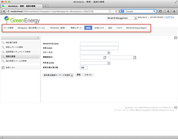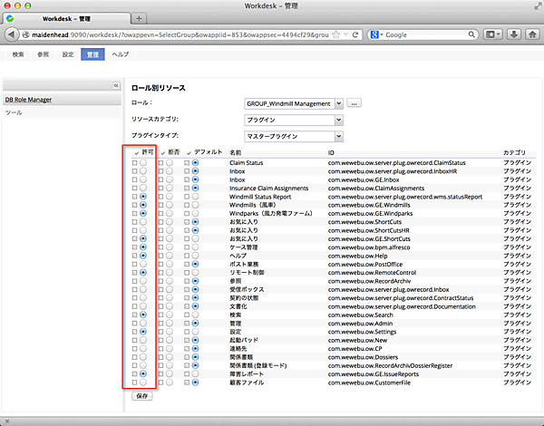 例えば、図2のように、Workdeskの上部のメニュー(赤枠)を役割毎に設定する場合には、管理画面で、ユーザーのロール(ユーザーグループ)にあらかじめ用意、またはユーザーが作成したプラグインを選択するだけです(図3の赤枠で許可されたプラグインのみが、図2のメニューになっています)。