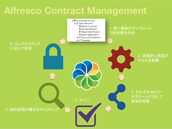 Alfresco Workdeskをすぐにビジネスで利用できるようにテンプレートとして用意しているのが、Alfresco Contract Managementです。Alfresco Contract Managementは契約書管理についてのテンプレート(図4)で、契約書の作成から、社内の承認プロセス、そして社外からサインされた契約書の返却からその保管まで、一連の契約の流れを管理することができます。