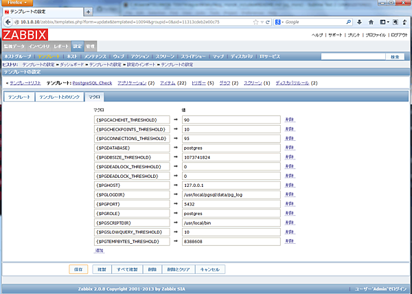 タブの「設定 (Configuration)」 - 「テンプレート (Templates)」を選択して表示された テンプレート一覧から「PostgreSQL Check」をクリックし、「マクロ (Macros)」タブを選択します。