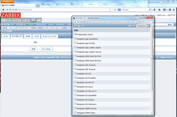 「テンプレート (Templates)」タブを選択して「追加 (Add)」をクリックし、 「PostgreSQL Check」を選択して「選択 (Select)」、「保存 (Save)」をクリックします。