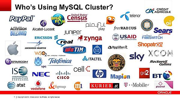 図1のような企業が、MySQL Clusterを使用しています。元々、携帯通信網の加入者データベースで使われていたということもあり、Alcatel Lucent、Juniper Networksといった通信機器ベンダでも広く使われていますし、MySQLと統合されたことにより、オンラインゲームやクラウドサービスなど、Webアプリケーションのバックエンドとしての使用事例も増えています。