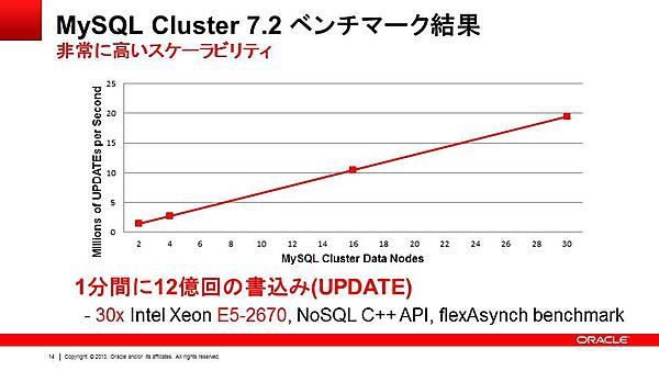 MySQL Clusterは、内部的に自動的にデータをシャーディング(分解して複数のサーバーに分散)することにより、書き込み処理に対しても高い拡張性を持っています。もちろん、どのような処理でも拡張性が出せる、という訳ではありませんが、MySQL Cluster向きのアプリケーションで使用すれば、図2のベンチマーク結果のように高い拡張性を実現可能です。