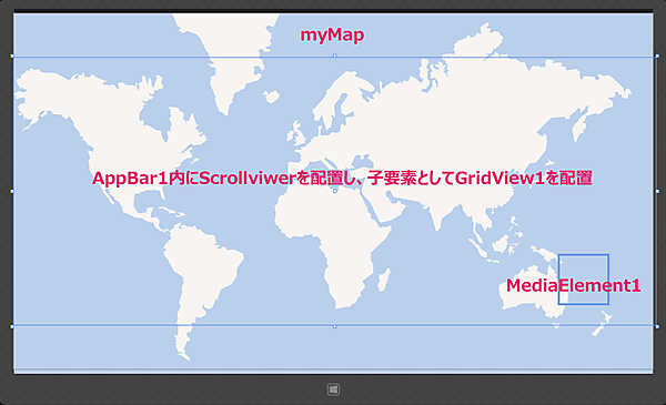 (4)名前が「MediaElement1」というMediaElement要素を配置します。キャラクターに天気予報を喋らすために必要です。