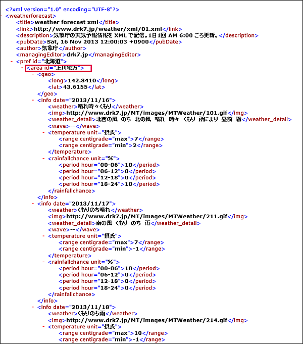 と指定して、指定したxmlFileNameの天気予報のXMLを取得します。例えば、「北海道」ならxmlFileNameは「01.xml」となり、「沖縄県」なら「47.xml」となります。これには、「気象庁の天気予報をXMLで配信」のAPIを使用しています。下記のURLを参照してください。