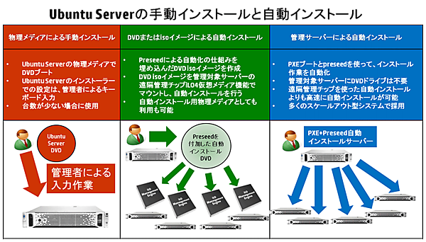 2. の方法は、PXEブートとpreseedによる無人インストールを行うための管理サーバーを構築する必要がありますが、管理対象サーバーにDVDドライブと遠隔管理チップがなくてもUbuntu Serverのインストールができます。多くのスケールアウト型のシステムやクラウド環境で採用されている方法です。