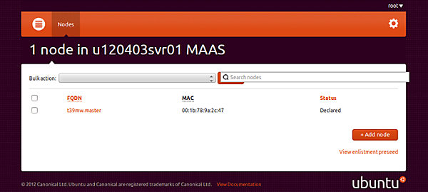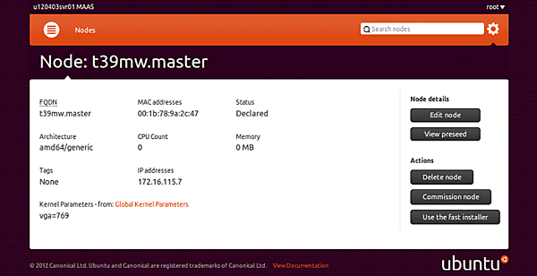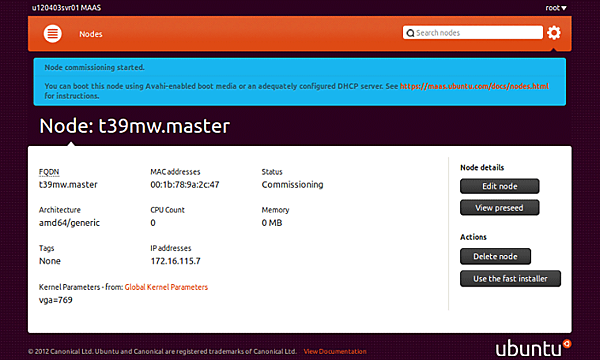 管理対象サーバーの初期登録時は、MaaSのWeb画面で「Status」が「Declared」になっています。この段階は、まだ管理対象サーバーにUbuntu Serverがインストールされているわけではありません。Ubuntu Serverを管理対象サーバーに配備するため、管理対象サーバーのステータスを変更する必要があります。管理対象サーバーのステータスを変更するには、管理対象サーバーのFQDNをクリックし、「Actions」欄にある「Commssion node」をクリックします。MaaSのWeb画面にてIPMIによる管理対象サーバーの電源管理が正しく設定されていれば、管理対象サーバーの電源が自動的に投入されPXEブートが開始します。