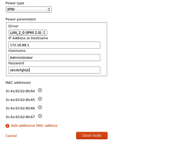 MaaS環境では、管理対象サーバーの電源管理設定が必要になります。これは、後述するOSSオーケストレーションを行うJujuを使ったOSSの自動配備を行う際に、サーバーの電源投入を自動的に行う必要があるためです。管理対象サーバーの電源管理設定は、MaaSのWebインタフェースから登録済みの管理対象サーバーをクリックし、「Edit node」をクリックします。管理対象サーバーがHP ProLiantサーバーの場合、図10のように、「Power type」のプルダウンメニューから「IPMI」を選択します。「Power parameters」枠の「LAN_2_0(IPMI 2.0)」を選択し、遠隔管理チップiLO4のIPアドレス、iLO4の管理者アカウント、パスワードを入力し、「Save node」をクリックすれば完了です。