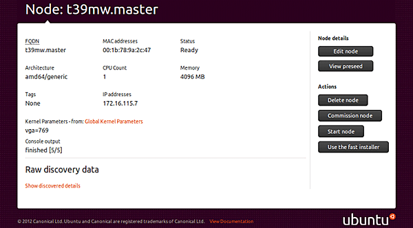 管理対象サーバーのコミッショニングが完了すると、管理対象サーバーが自動的にシャットダウンされます。MaaSのWeb画面上の「Nodes」をクリックし、管理対象サーバーの「Status」が「Ready」になっているかを確認してください。管理対象サーバーのFQDNをクリックし、再び状態を確認すると、「Actions」の所に「Start node」が表示されているはずです。「Start node」をクリックし、管理対象サーバーを再びPXEブートさせるとUbuntu Serverの自動インストールが開始されます。