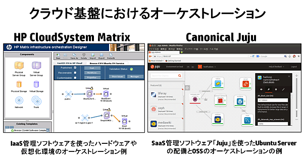Canonical社が提供するJujuは、OSS環境をGUIによって簡単に紐付けて連携させることができます。一般的に、OSSに限らず、クラウド基盤において様々なコンポーネントを連携させて一つの目的を持ったサービスやシステムを自動的に構築・稼働させることを「オーケストレーション」といいます。ハードウェアベンダーは、クラウド・アプライアンスにおいて、様々なハードウェアコンポーネントとOSの配備、連携を自動化する「オーケストレーション」の仕組みを提供しており、Canonical社のJujuもこれと同様のコンセプトを持っています。
