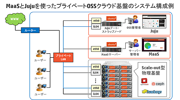 Jujuを利用するためには、MaaSノードとは異なる別のサーバーに「Jujuブート・ストラップノード」を構築します。MaaSサーバー上にインストールしたjujuコマンドを使い、管理対象サーバーをPXEブートさせてOSとJujuを自動インストールし、Jujuブート・ストラップノードを構築します。JujuのWeb画面(Juju GUI)はJujuブート・ストラップノードで提供することが可能です。MaaSとJujuのシステム構成例を以下に示します。