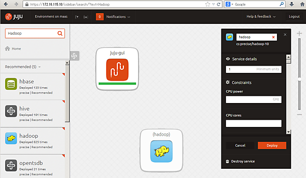 Jujuで導入可能なOSSのコレクション(Juju Charmと言います)は、Juju GUIで検索が可能です。例えば、Hadoopを配備したい場合、Juju GUIの左上にある検索入力フォームに「Hadoop」と打ち込み、Enterキーを入力します。すると、Hadoopに関連するOSS一覧の検索結果が表示されますので、インストールしたいCharmをマウスで右側にドラッグ・アンド・ドロップして下さい。すると、Hadoopに関するパラメーター等を入力するウィンドウが右側に現れますので、「Deploy」をクリックすると管理対象サーバーの電源が自動的に投入され、Ubuntu ServerとHadoopが自動的にインストールされます。