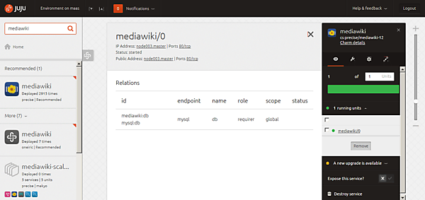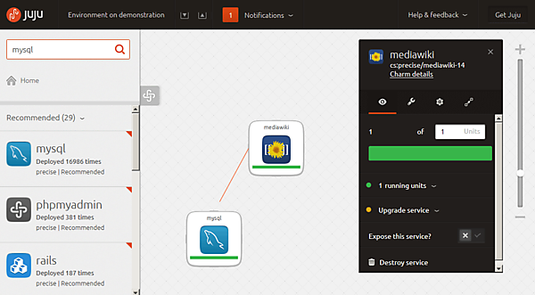 MediaWikiは、ウィキペディアと同様のコンテンツ管理システムを作成することができるOSSですが、MySQLとの連携を必要とします。MediaWikiとMySQLでオーケストレーションを行うには、まず、Juju GUIからMySQLとMediaWikiを検索し、Juju GUI上にドラッグ&ドロップします。配備したMediaWikiの図柄上にマウスでポイントすると「Build Relation」と表示されますので、さらにそれをクリックし、MySQLの図柄にマウスを近づけるとMediaWikiとMySQLが線で結ばれます。これにより、MediaWikiとMySQLのリレーションが完成します。