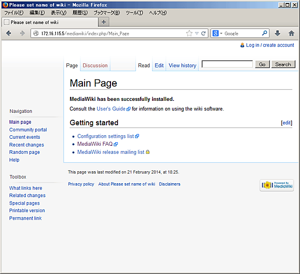 MySQLとリレーションが構築できたので、MediaWikiにWebブラウザでアクセスしてみます。