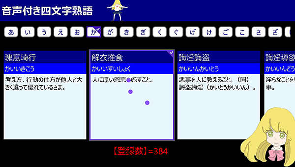 今回のアプリは、50音を選択して、その50音で始まる四文字熟語の読みと意味を表示します。「四文字熟語」または「読み」の部分をタップすると、「意味」をキャラクタが読み上げます(図1)。「意味」の部分をタップしても読み上げませんので、注意してください。また、たまに四文字熟語を表示させても、キャラクタが読み上げない場合があります。その場合は別な四文字熟語を選択してみてください。読み上げるようになると思います。