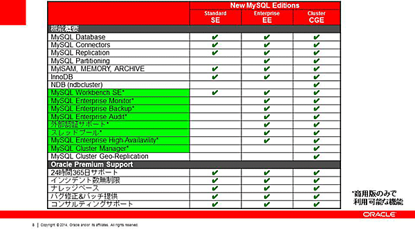 MySQLの商用版には、Standard EditionとEnterprise Editionの2つのエディションがあるのですが、Enterprise Editionではサポートサービスに加えて商用版のみの便利な追加機能が全て使用可能となっています(前回ご紹介したMySQL Clusterにも商用版があり、こちらはMySQL Cluster Carrier Grade Editionとなります。MySQL Cluster Carrier Grade Editionでも商用版のみの追加機能が全て使用可能です)。