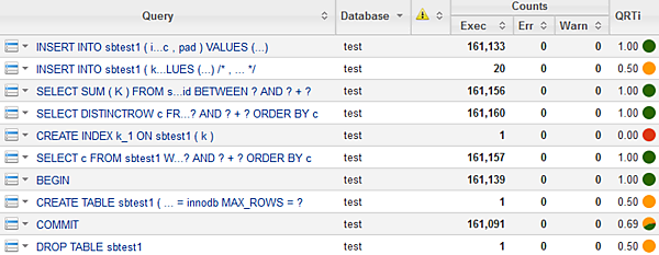 データベースに対するSQLの実行時間は○秒以内でいけない、といった目標値が明確に定められている場合など、SQLの実行時間が目標値以内に収まっているかどうかが一目で確認できます(デフォルトの設定では、実行時間が100ms以内のSQLがOptimumに、100ms~400msのSQLがAcceptableに、400msよりも時間がかかったSQLがUnacceptableに分類されます。全てのSQLがOptimumに分類されると、QRTiは1.00となり、円グラフは緑色になります)。
