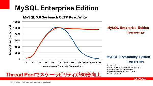 - 大規模なWebサイトなど、同時実行処理数が多い環境で活用できる機能です。図7のベンチマークのように、スレッドプールがあると処理数が多くなった場合でも性能がほとんど落ちないため、突発的に負荷が高くなった場合などでもスローダウンせずにすみます。