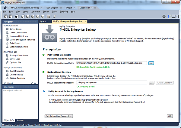 - MEBはローカルのファイルしか操作できないためMySQLサーバを実行しているサーバにて動作させる必要があります。またWindowsプラットフォーム上ではローカルのMySQLインスタンスに対してのMEB実行しか管理できないためWorkbenchも同様にローカルで実行する必要があります。