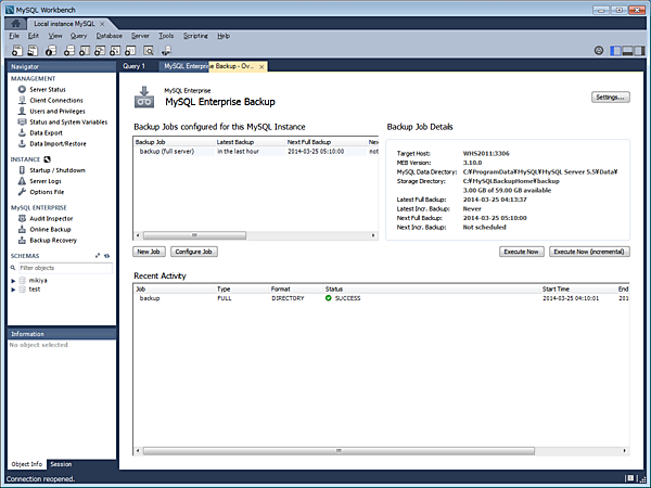 MySQL WorkbenchはMySQL Enterprise Editionで利用できるMEB(MySQL Enterprise Backup)を利用するためのGUIを備えています。
