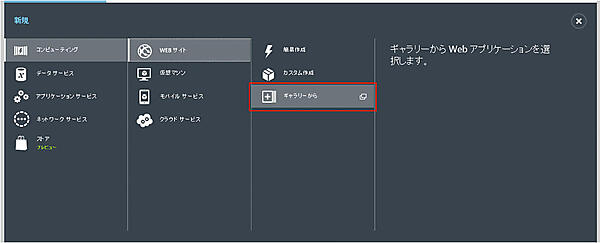 では、実際に1st Stageの課題であるWordPressをインストールしてみましょう。Microsoft Azureの管理ポータルにアクセスし、コマンドバーにある[+新規]をクリックして、[コンピューティング]-[WEBサイト]-[ギャラリーから](図1)を選択します。
