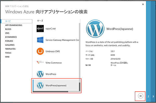 [Windows Azure向けアプリケーションの検索]画面が表示されますので、[WordPress(Japanese)]を選択し、右下の矢印アイコンをクリックします(図2)。
