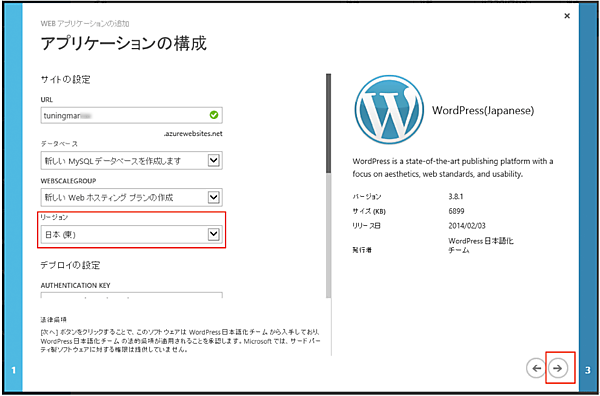 サイトやWordPressの設定などを行います。URL、データベース、リージョン、WordPressで使用する認証用ユニークキーなどを設定し、右下の矢印アイコンをクリックします。今回は、「日本(東)」を選択しています(図3)。