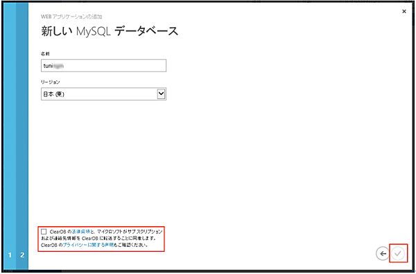 MySQLデータベースを作成します。リージョンは先ほどと同じ「日本(東)」を選択し、今回使用するMySQLデータベースはClearDB が提供しているサービスとなりますので、ClearDB の使用許諾に同意の上チェックを入れて、右下のチェックマーク(図4)をクリックすると、デプロイが始まります。