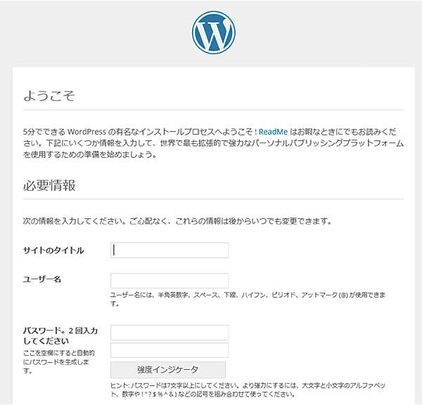 作成したWebサイトの右側にあるURLをクリックしますと、WordPressのインストールページ(図6)が表示されます。必要な情報を入力してWordPressをインストールします。