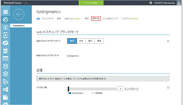 インストールが無事完了しましたら、1st Stageの負荷に最低限耐えられるように設定を変更します。管理ポータルに戻り、先ほど作成したWebサイトの名前をクリックします。Web サイトのスタート メニューが表示されますので、画面上部のタブから [スケール] をクリックして、Webサイトのスケールの設定画面を表示します(図7)。