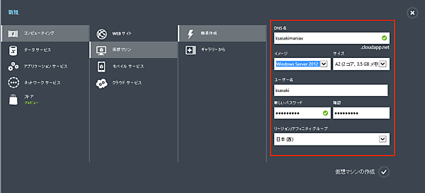 - 「リージョン/アフィニティグループ」は、仮想マシンの配置場所の指定です。現在、日本には関東と関西の2リージョンありますので、どちらかをお使いください。