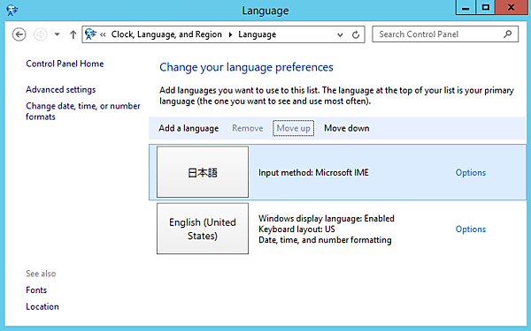 - 次の画面でも”Add a language”をクリックして、日本語を追加します。また、”Move Up”で英語より上に持ってきます。さらに”Options”をクリックします。
